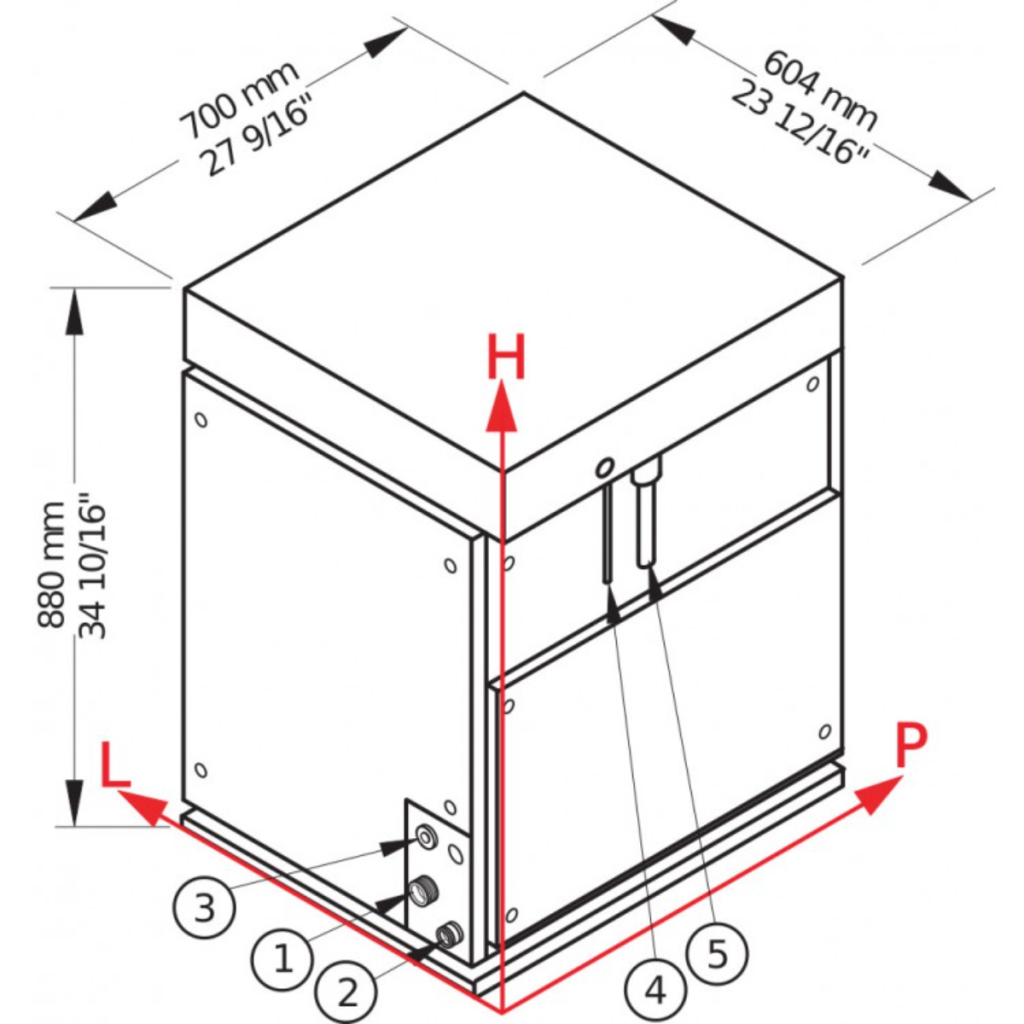Корпус выполнен из нержавеющей стали AISI 304 с отделкой Scotch Brite, испаритель — из алюминиевого сплава Anticorodal, рама — из нержавеющей стали, детали — из пластика ABS. Модель оснащена электромеханическим управлением, вертикальным фиксированным испарителем «без утечек» и фильтром от накипи.