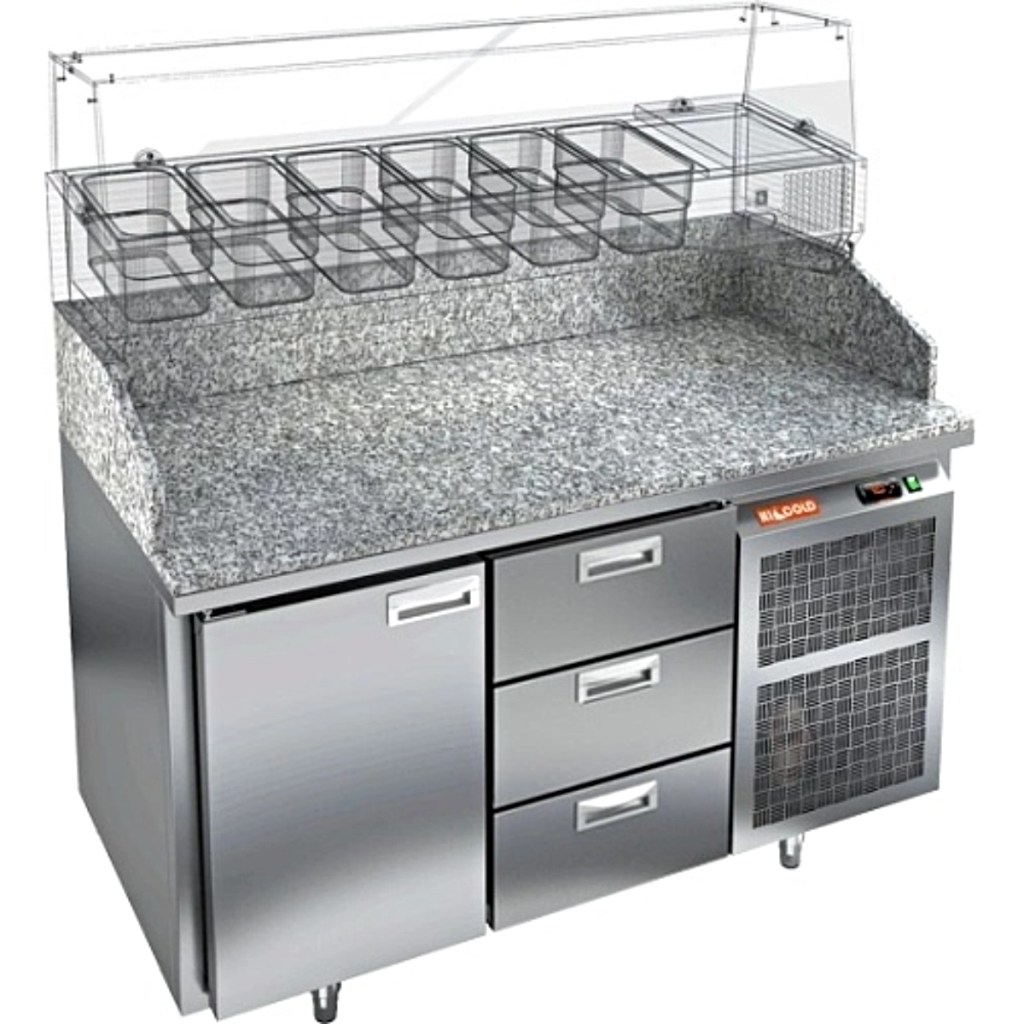 HiCold PZ3-13/SN камень — надежный и функциональный стол для пиццы с гранитной столешницей, просторной рабочей зоной и эффективным охлаждением. Наличие глухой двери и трёх выдвижных ящиков обеспечивает удобное хранение ингредиентов, а прочный корпус из нержавеющей стали гарантирует долговечность и практичность для профессиональной кухни.