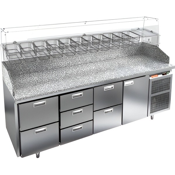 HiCold PZ3-2321/GN камень — это надёжный и функциональный холодильный стол для пиццы, который сочетает прочность, эргономику и эффективное охлаждение. Благодаря гранитной столешнице, корпусу из нержавеющей стали, двум глухим дверям и двум выдвижным ящикам он станет универсальным решением для профессиональной кухни.